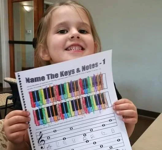 Young girl smiling and holding a music worksheet titled 'Name The Keys & Notes - 1,' with colorful keyboard illustrations and musical notes.